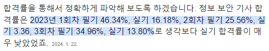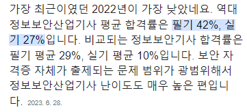 정보보안기사의 합격률은 극악인 편입니다.